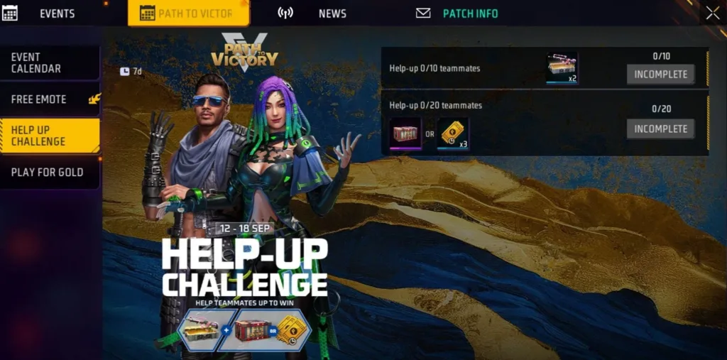 The Free Fire Help-Up Challenge, introduced as one of the concluding events within the Path to Victory game mode, made its debut on September 12, 2023. Gamers have the opportunity to participate in this event, which is scheduled to run for approximately one week, concluding on September 18, 2023. To claim the associated rewards, players are tasked with fulfilling certain criteria during this designated time frame.