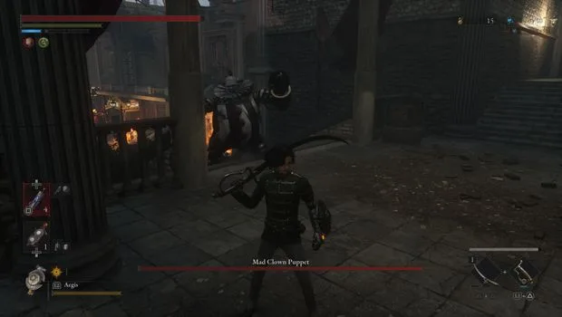 Alternatively, you can use a cheesy strategy by stocking up on various throwables. Provoke the boss from a distance and keep him in your throwable range while avoiding his attacks. When he approaches a certain limit (the spot where the first puppet was setting the gate on fire), he’ll retreat. Follow him, land some hits, and then retreat. Repeating this process will eventually lead to victory against the Mad Clown Puppet boss.