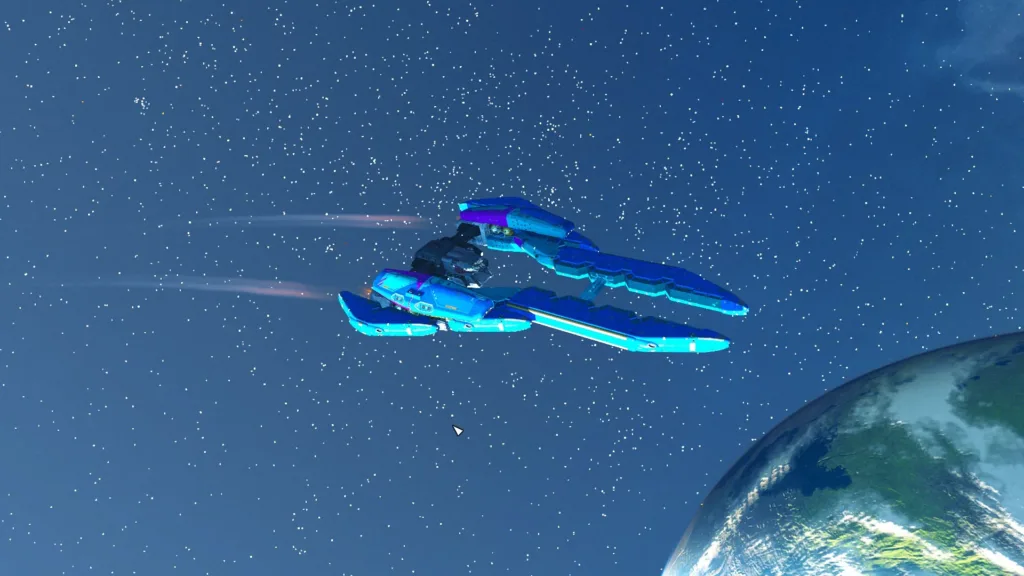Constructed using a combination of Nova cockpit, Taiyo landing bay, tunnel habs, and reactors, this ship prioritizes speed and mobility, making it unsuitable for space combat due to its lack of weaponry. Its striking blue-ethereal design, reminiscent of the Energy Sword, adds an extra layer of appeal to this unique creation.