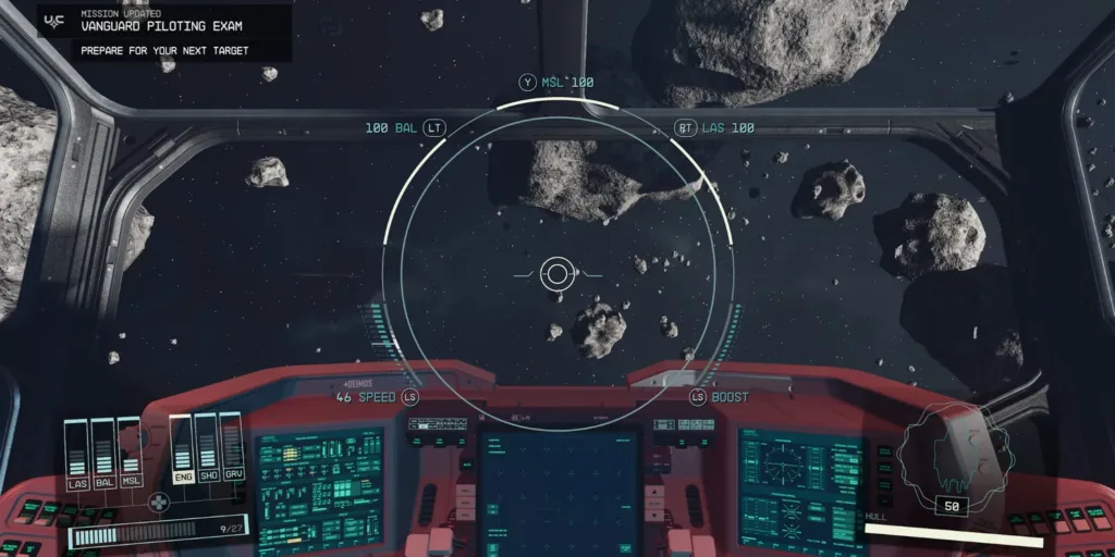Within the Orientation Hall, players can explore exhibits that provide historical context for the Starfield universe and information about various factions. Subsequently, players head to the Piloting Simulator, where they take part in simulated space battles, divided into six tiers. Completing three tiers is sufficient to proceed, but players can tackle additional tiers for extra rewards.