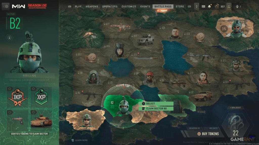 Initiating from the main menu, players can deploy battle pass tier skips in MW2 and Warzone, selecting their sector. With a total of 21 combat sectors in MW2 and Warzone. Each containing a high-value target as the main point of interest, players have the flexibility to choose their priorities. In addition to the high-value target, each sector features five extra items, all accessible by exchanging a tier skip.