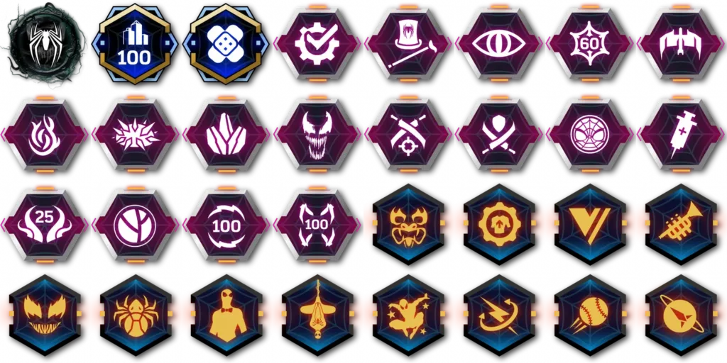 | Evolved | Silver | Defeat 100 enemies with Evolved Venom abilities. Unlocked by defeating 100 enemies with Miles’ Evolved Venom Abilities (blue icons). |