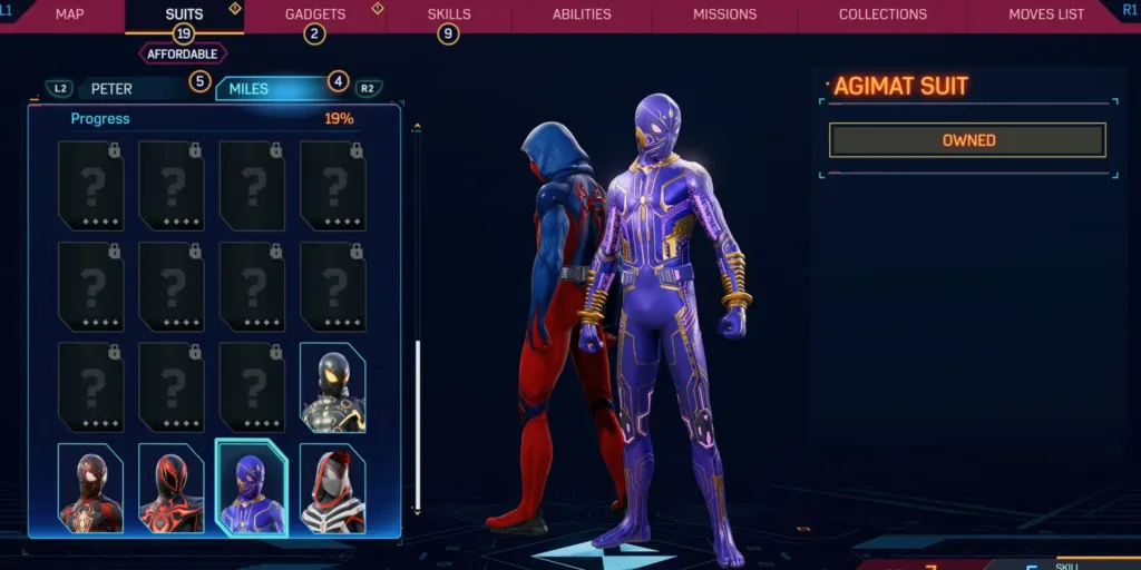 To change suits, players navigate to the Suits tab by pressing the touchpad and then using the R1 or L1 buttons to switch between Peter and Miles. All available suits for the respective Spider-Man can be viewed, and players can select their desired suit by pressing the X button.