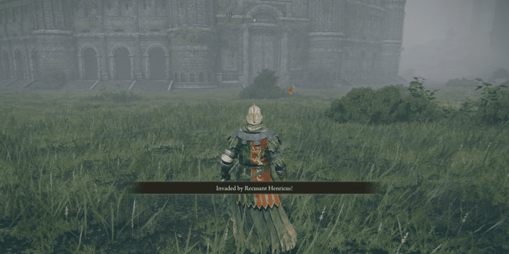 Encountering Recusant Henricus triggers a sudden combat engagement. This invader, clad in full-body armor and wielding the Ash of War: Eruption mace, appears near the northeastern gates of a significant structure, close to Stormhill Shack.