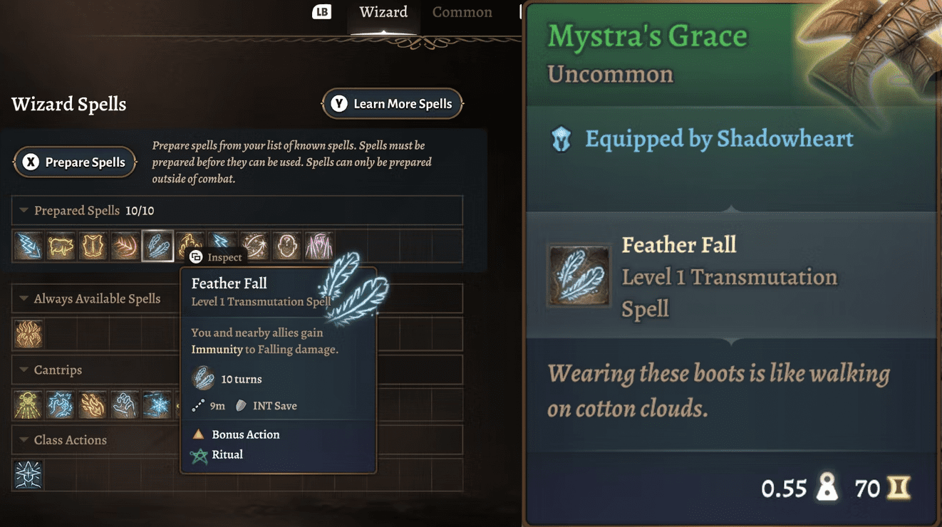 - Use the Spellbook or equip Mystra’s Grace to gain access to the Featherfall spell.